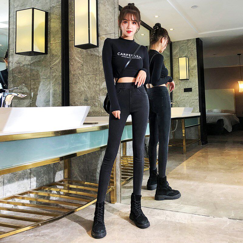 秋冬高腰紧身弹力黑色牛仔裤女加绒加厚修身显瘦小脚铅笔长裤灰色