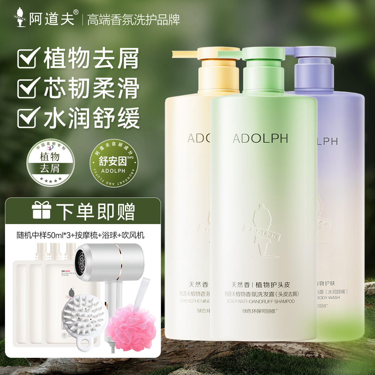 王一博同款阿道夫天然香植物去屑去油蓬松洗发水男女沐浴套装正品