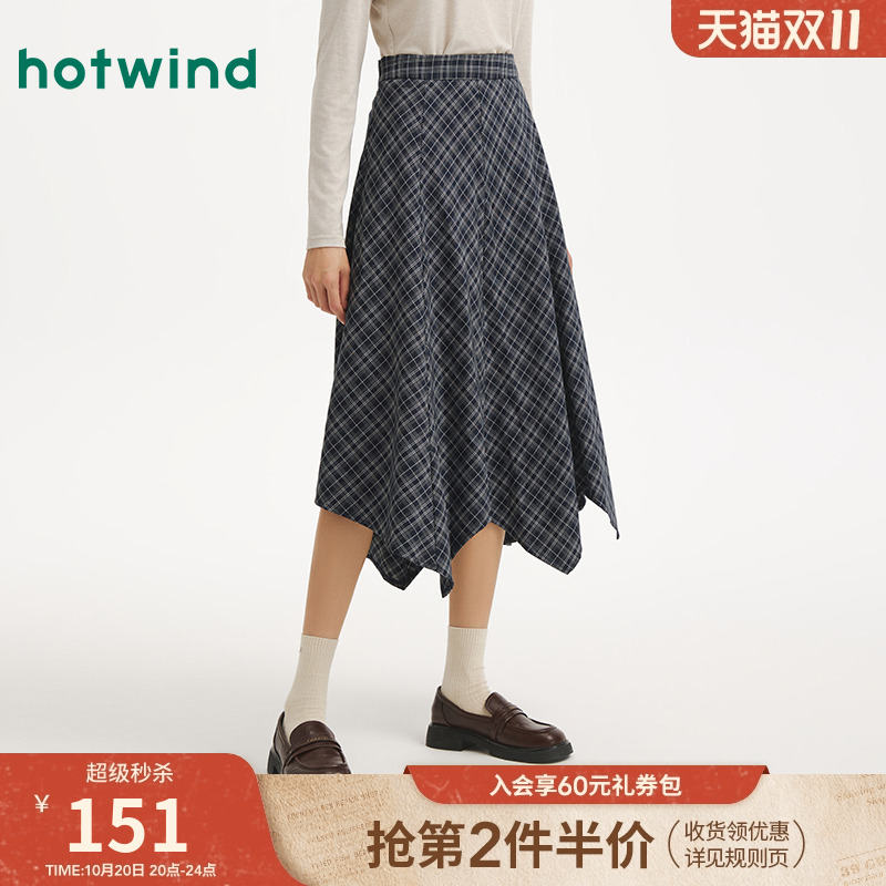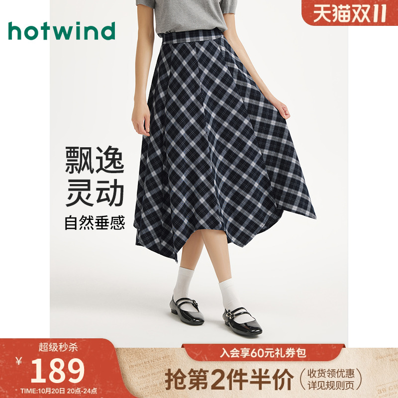 热风女士格子半身裙2025年秋季新款松紧腰不规则格子复古文艺半裙