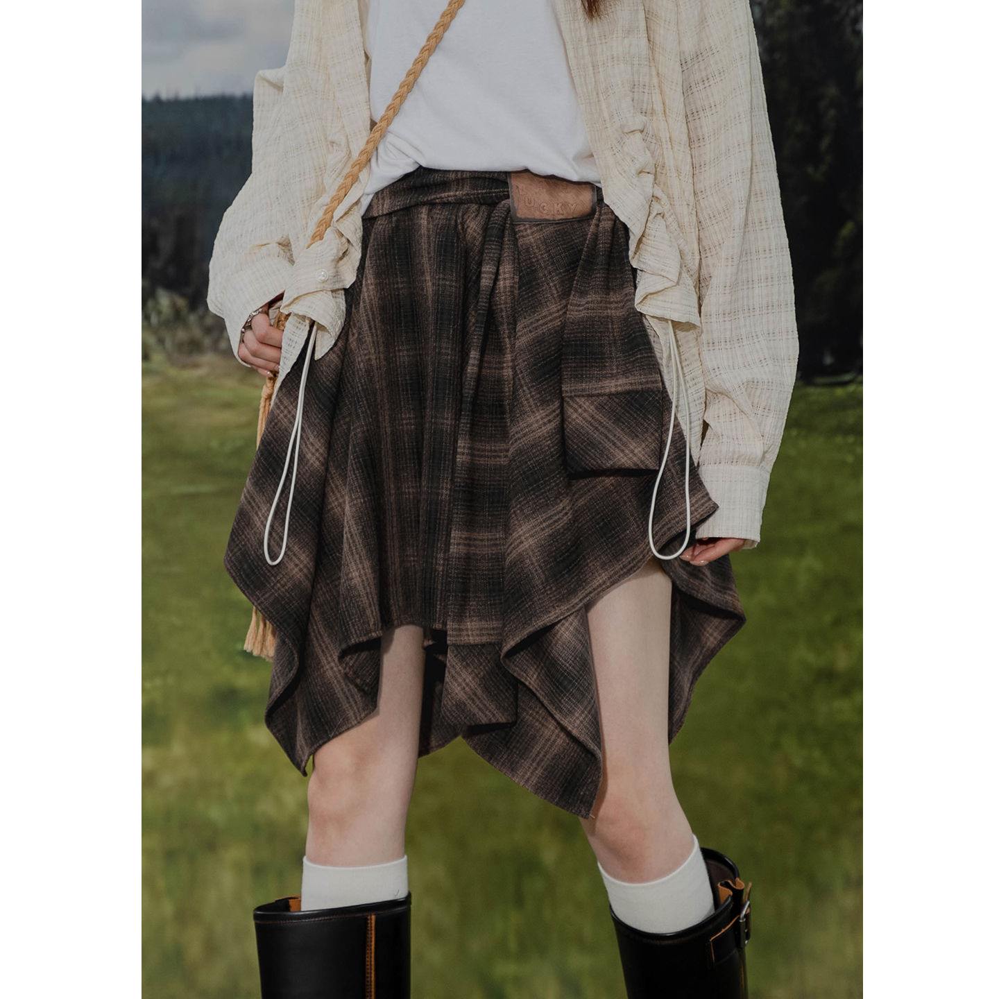 设计感不规则格子毛呢半身裙小众绑带防光内衬做旧百搭街头A字裙