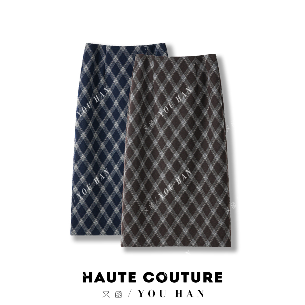复古毛呢格子半身裙女高腰显瘦开叉直筒秋冬季加厚加绒包臀长裙子