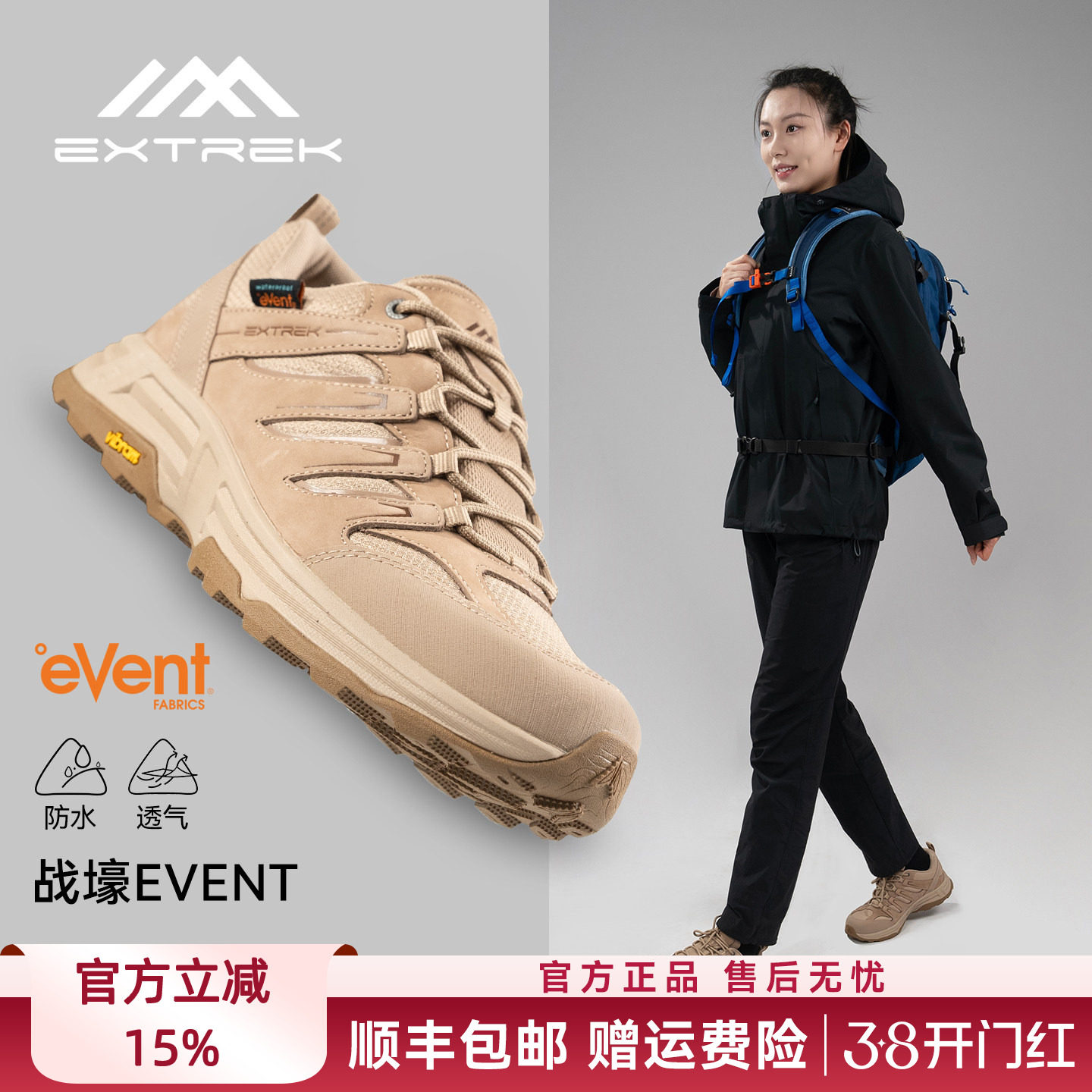 Extrek/天越徒步鞋女战壕低帮户外鞋event防水Vibram防滑登山鞋男