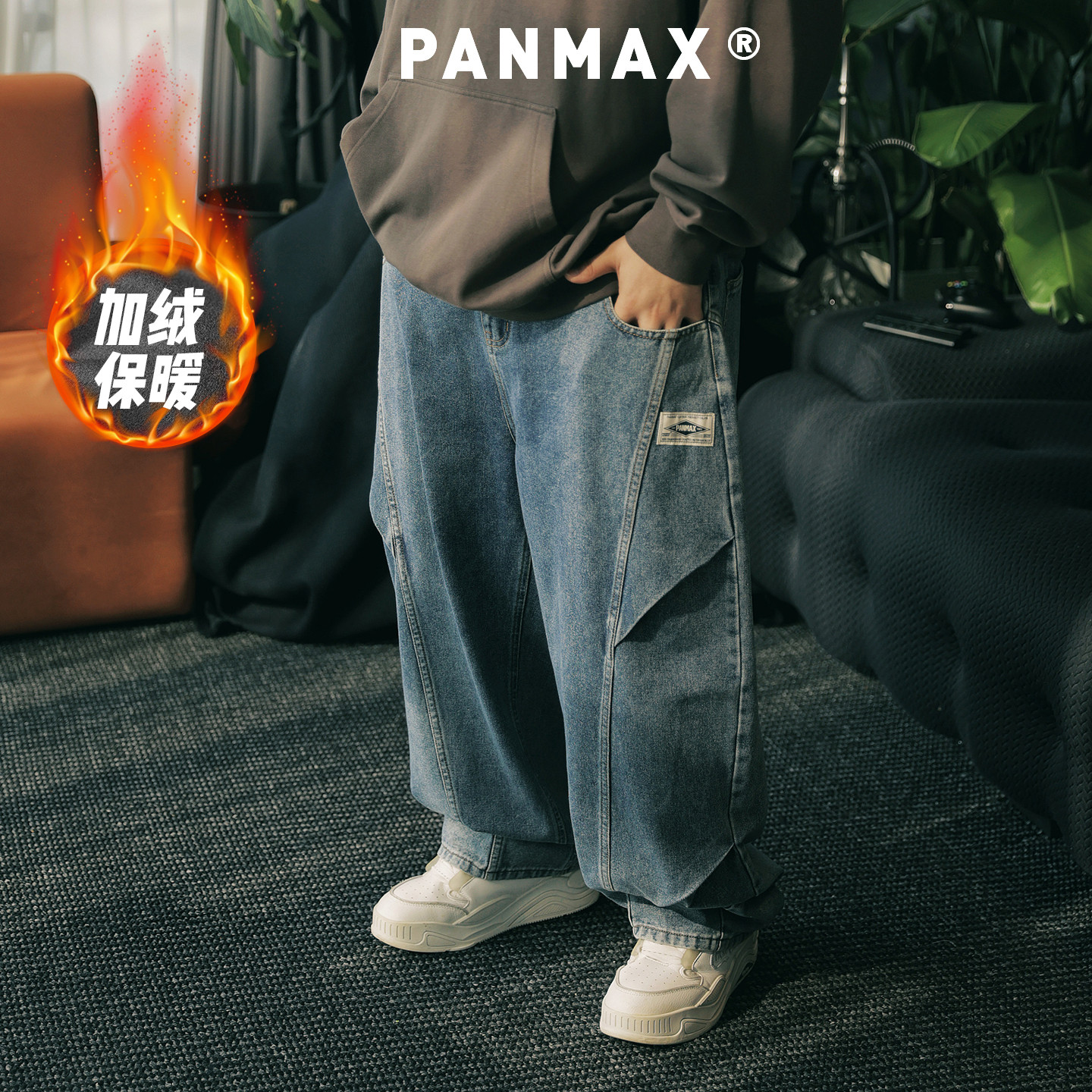 PANMAX大码潮牌男装秋季弯刀做旧复古牛仔裤立体加大休闲长裤加绒