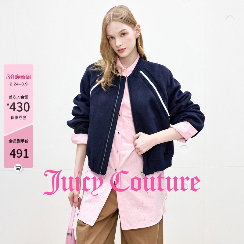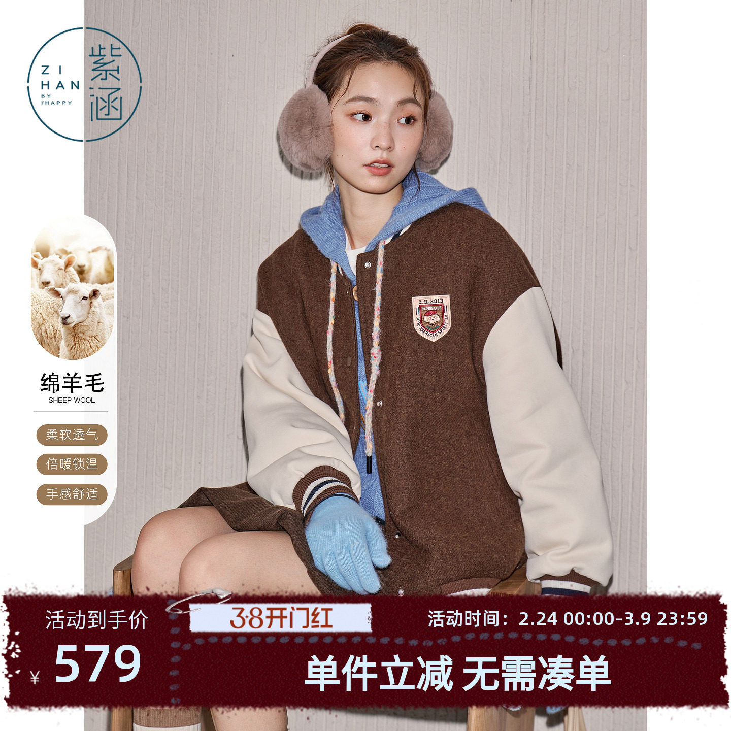 紫涵羊毛呢棒球服女2025年冬季新款学院风撞色拼接宽松圆领短外套