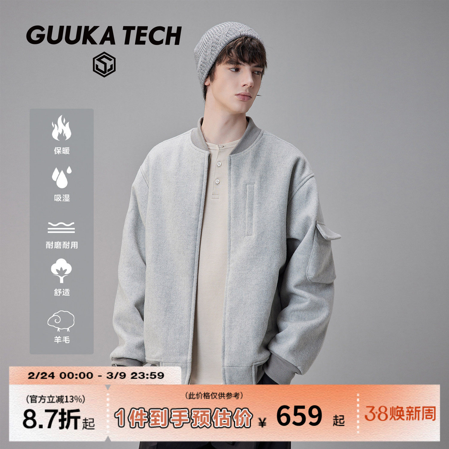GUUKA TECH灰色飞行员夹克男款春季绵羊毛外套毛呢棒球服落肩宽松