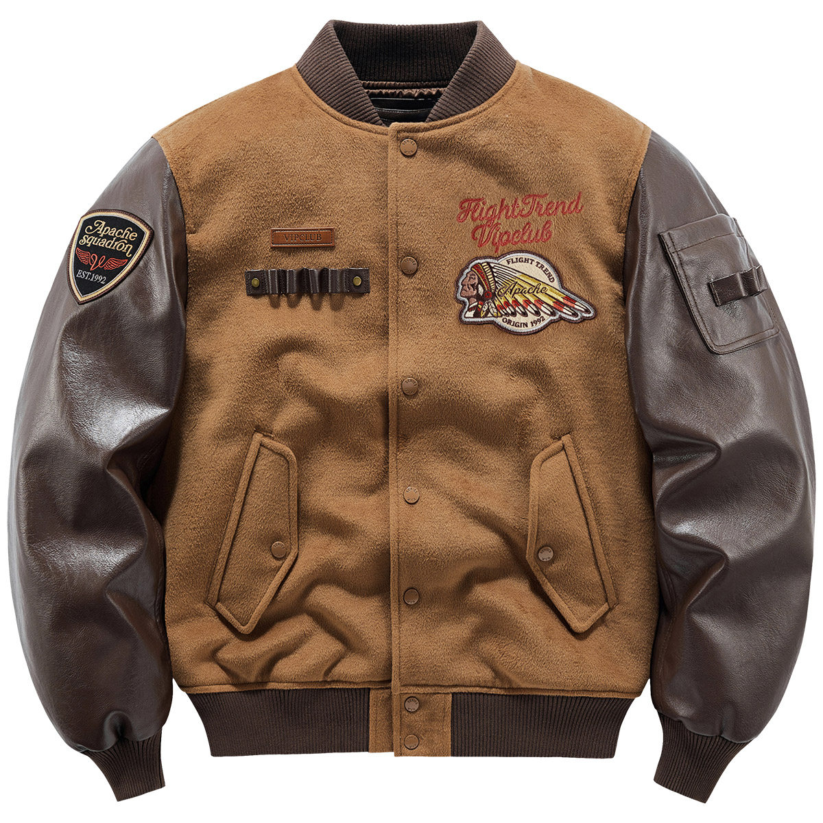 VIP毛呢棒球服男美式复古刺绣飞行夹克皮袖拼接vintage工装外套潮