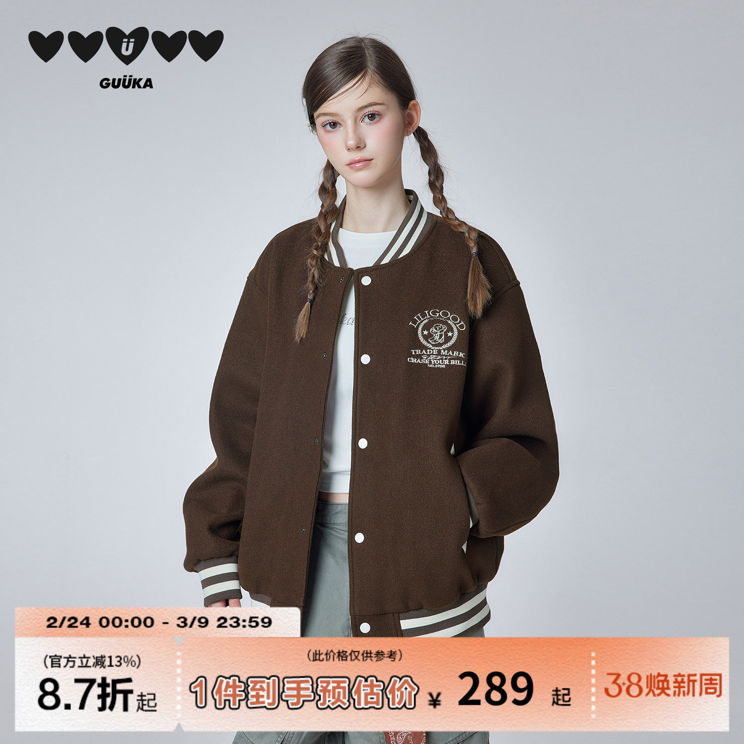 GUUKA字母刺绣正肩老钱风外套女 潮牌毛呢棒球服夹克情侣春季新款