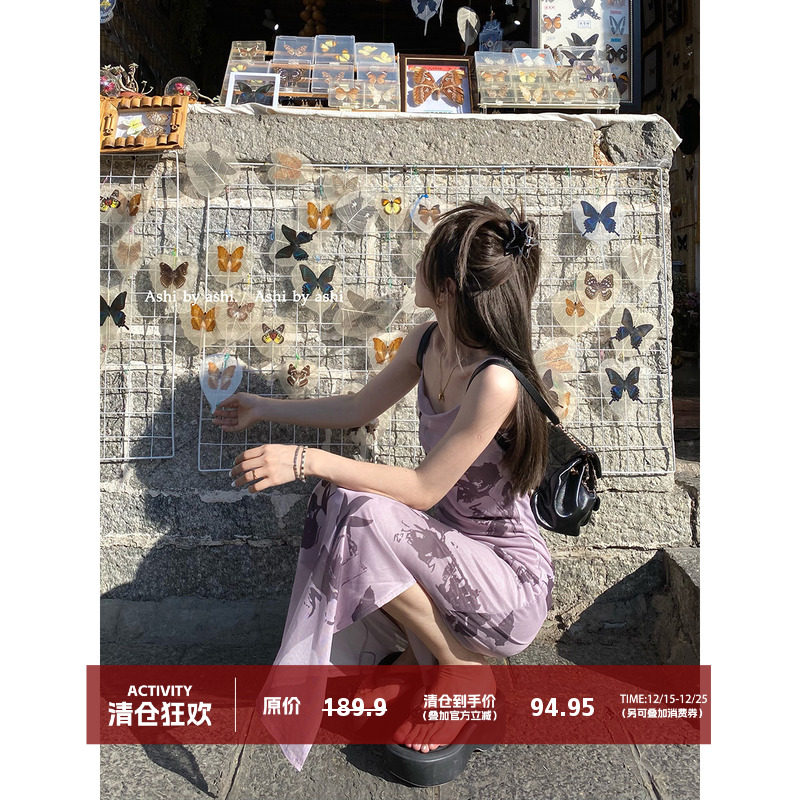 大于诗集法式蝴蝶网眼复古印花水墨吊带裙女收腰修身显瘦度假裙夏
