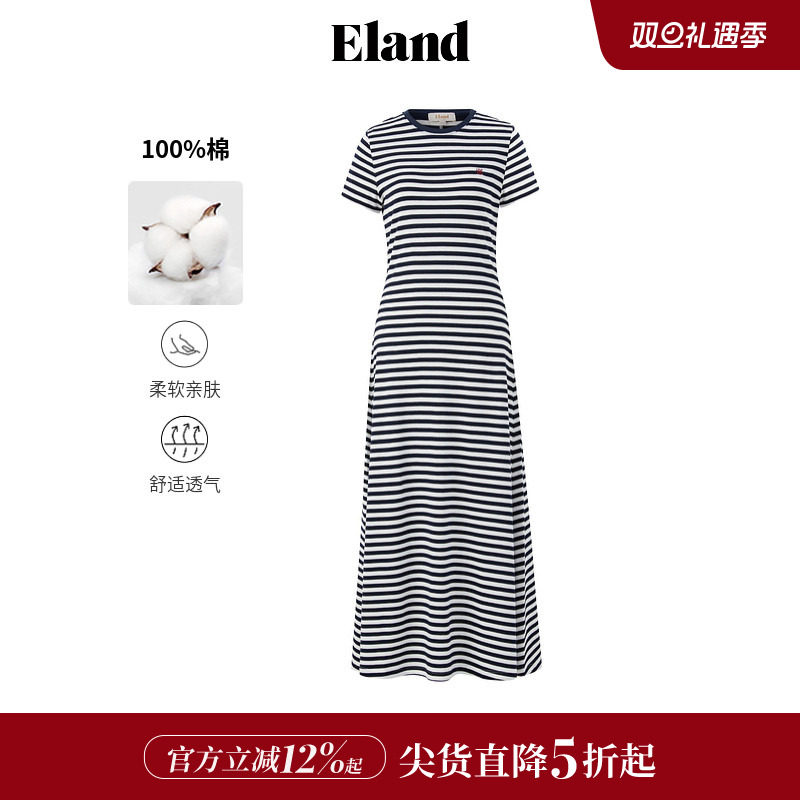 【100%棉】Eland衣恋连衣裙女学院撞色条纹圆领轻薄舒适裙夏