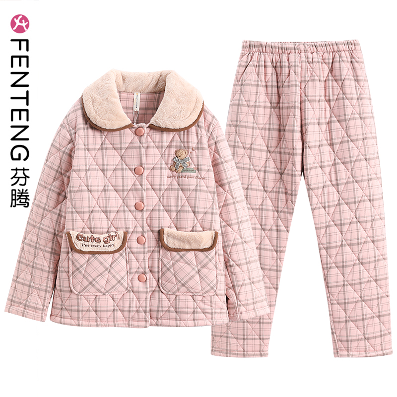 芬腾秋冬季女士睡衣纯棉加厚格子全棉薄夹棉甜美可爱高级感家居服