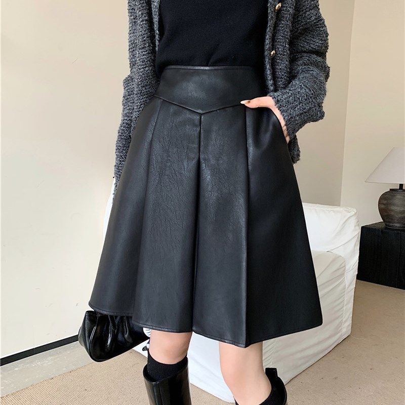 大码皮裙半身裙女中裙高腰口袋a字裙秋冬遮肚子显瘦中长款百褶裙