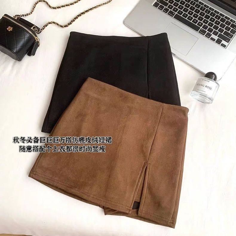 仿麂皮绒半身裙女复古气质高腰a字裙秋冬新款开叉包臀防走光短裙