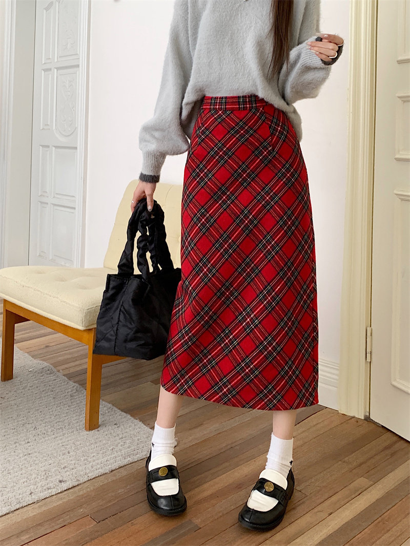 喜庆红色格子中长款半身裙高腰毛呢A字裙秋冬氛围感显瘦一步裙子