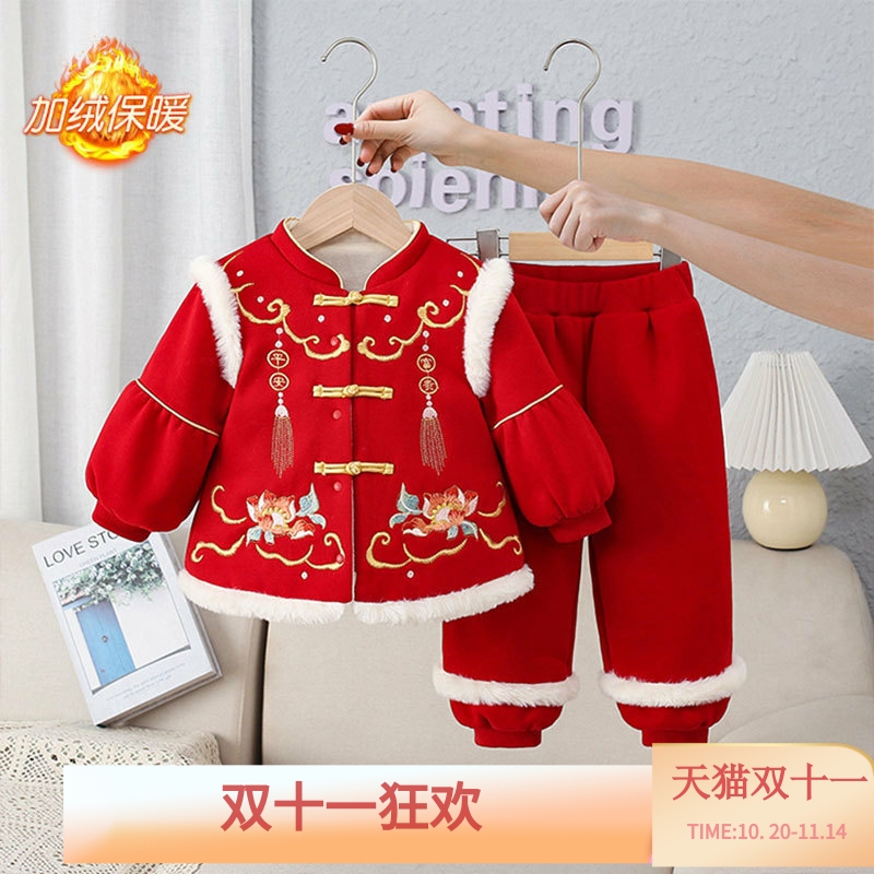 女童秋冬衣服女宝宝周岁礼服唐装喜庆拜年服过年中式分体两件套装