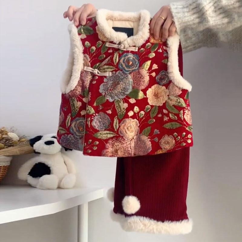 女童国风套装冬装新款儿童中式唐装拜年服马甲女宝宝过年周岁礼服