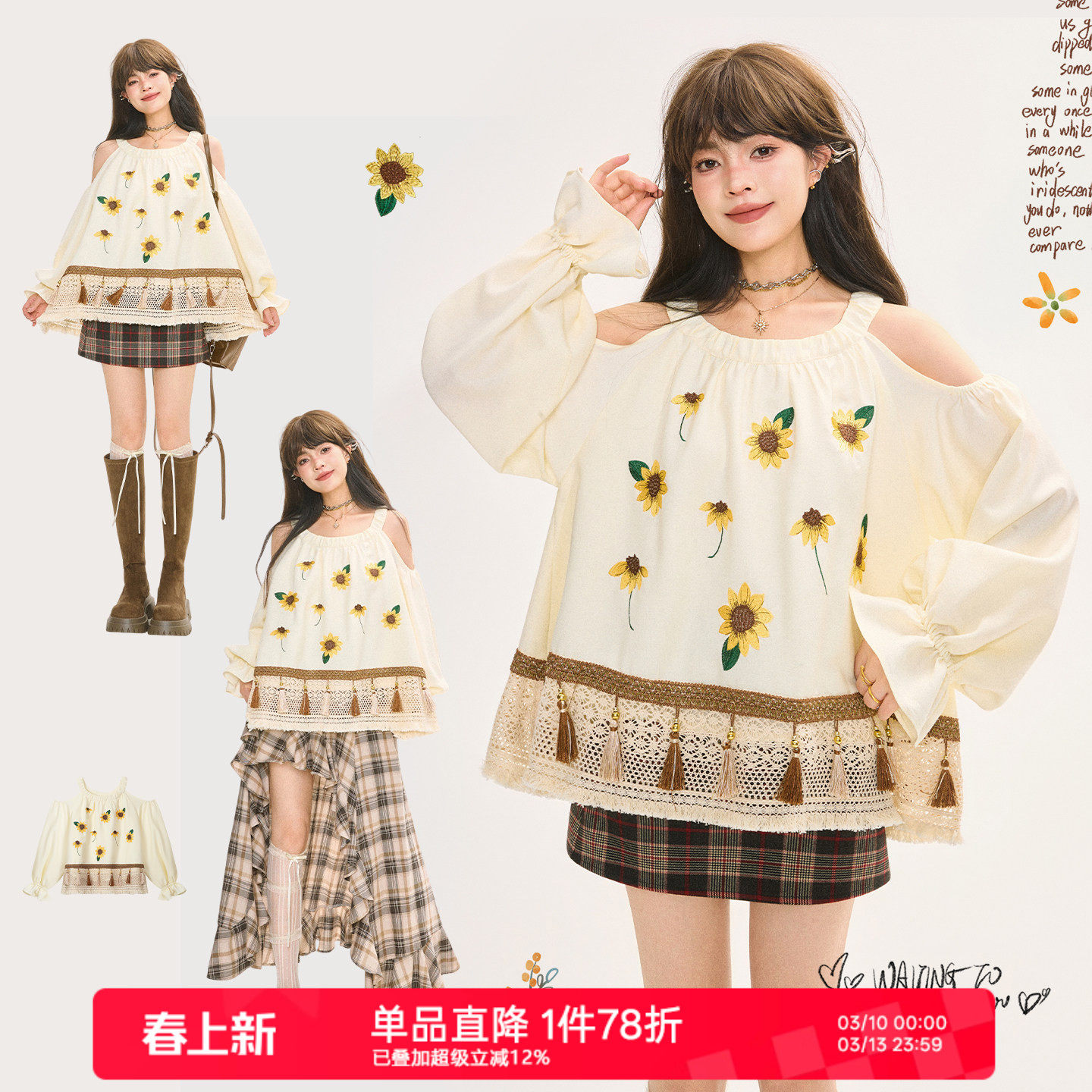 KEIKO 田园风碎花刺绣露肩上衣女2026春夏度假出游蕾丝花摆衬衫