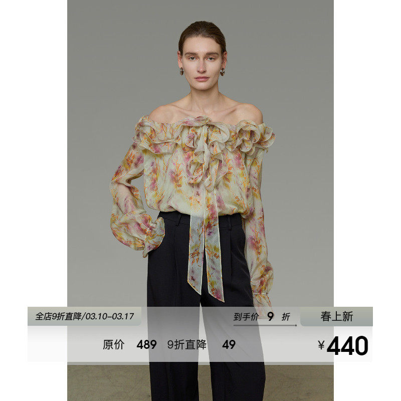 白鹿语荷叶边印花雪纺衬衫女长袖26春新浪漫不对称露肩一字领上衣