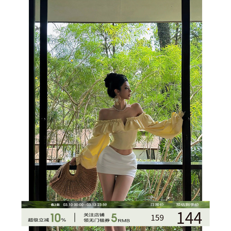 福尔尼斯悦 法式一字肩上衣女2026早春新款泡泡袖短款露肩衬衫