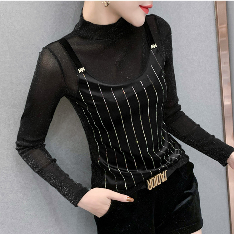 半高领打底衫女长袖秋冬新款时尚网纱拼接烫钻假两件上衣洋气小衫