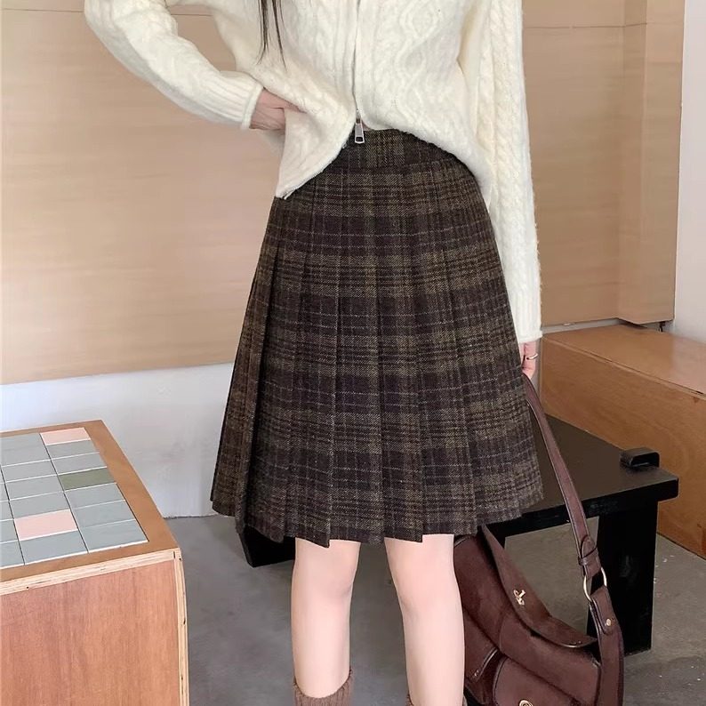 复古咖色百褶裙女秋冬学院风a字高腰毛呢半身裙气质加厚百搭中裙