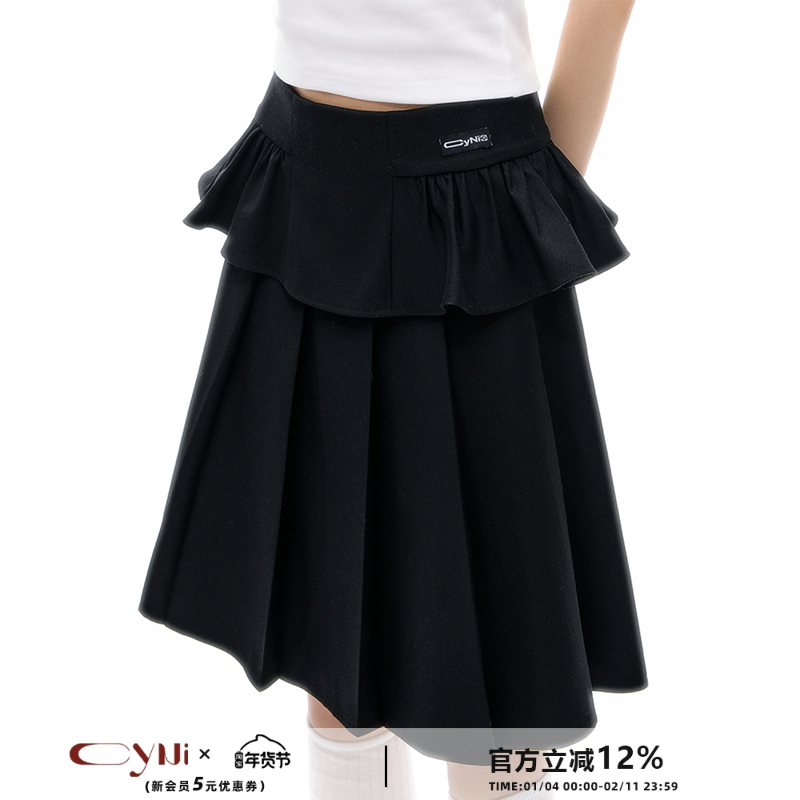 CyNi 甜美荷叶边拼接西装百褶A字裙中裙黑色简约基础百搭半裙女