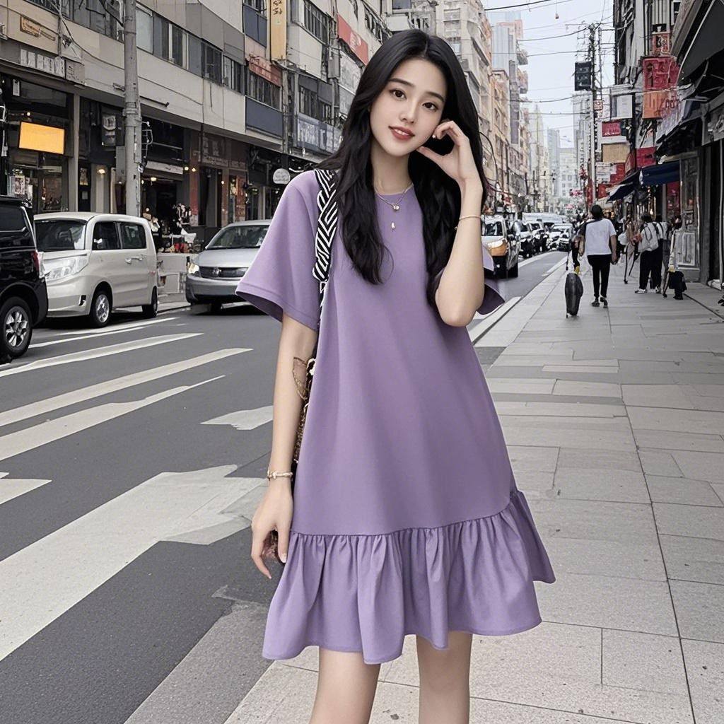 外贸原单紫色针织连衣裙女弹力印花透气显瘦宽松百搭a字裙中裙子