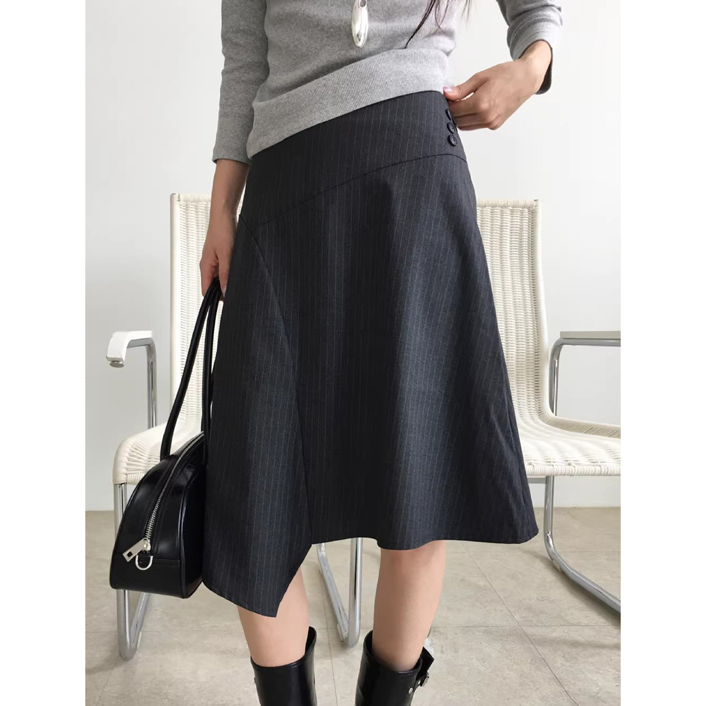 设计感纽扣装饰不规则条纹半身裙女早春复古高腰显瘦A字裙中裙子