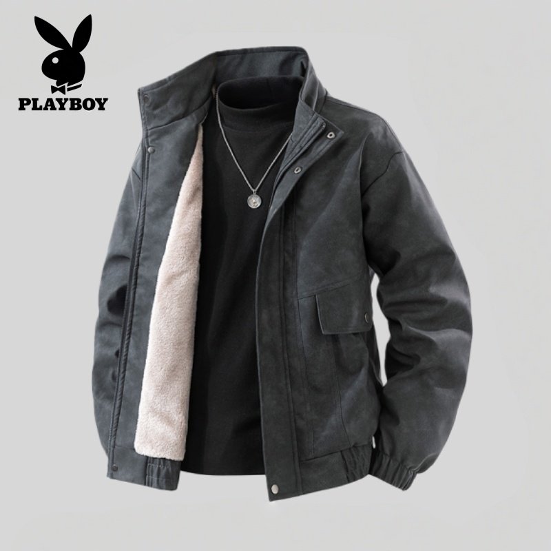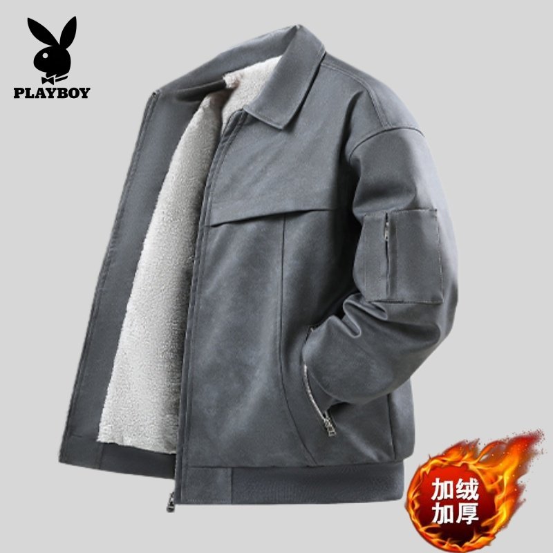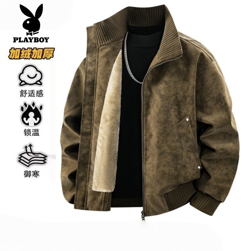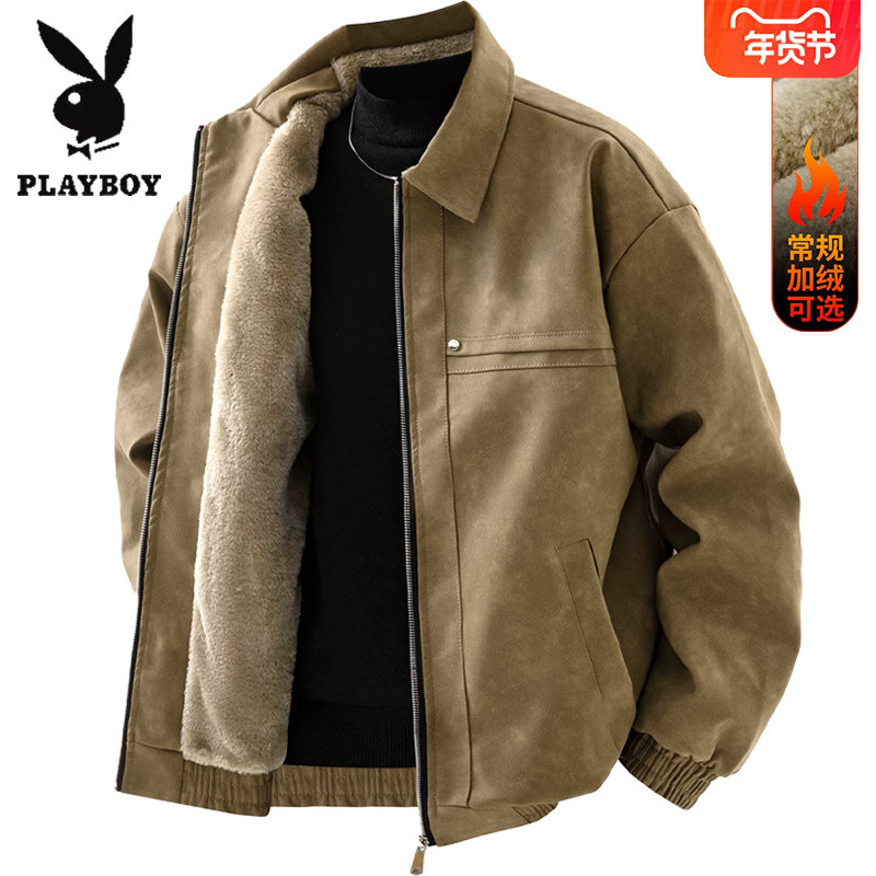 花花公子美式冬季加绒加厚皮衣男士2025新款日系休闲保暖夹克外套