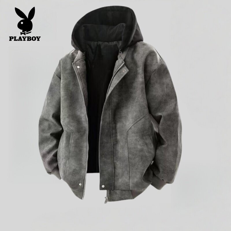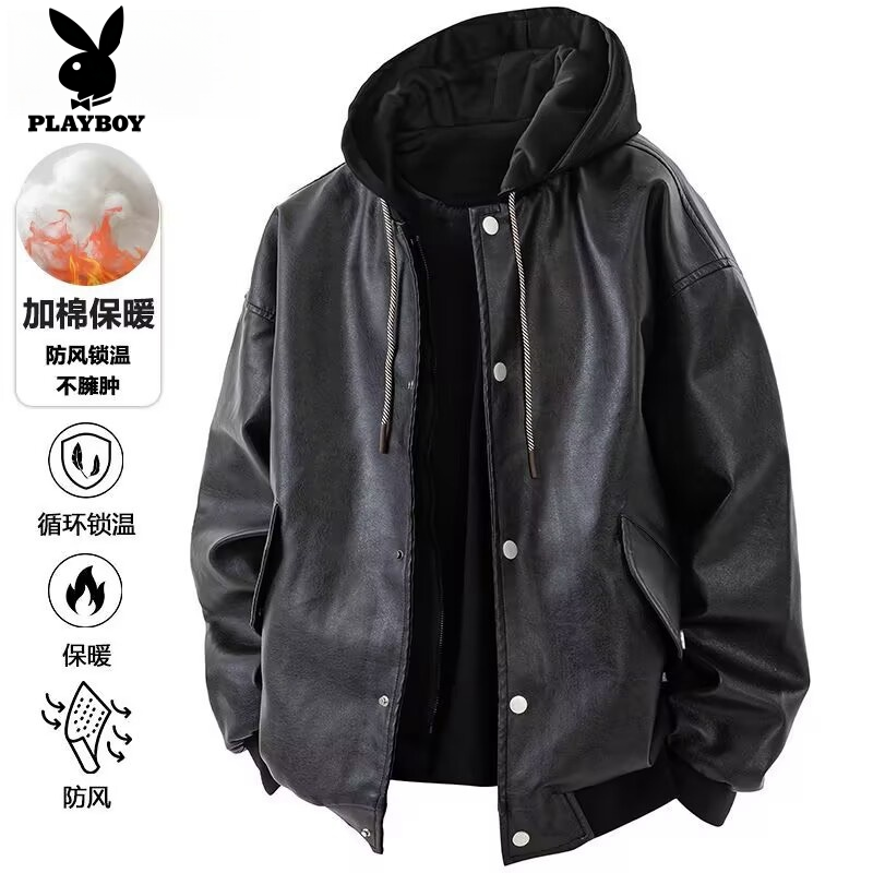 花花公子秋冬季新款PU皮衣休闲假两件夹克男连帽日系复古百搭外套