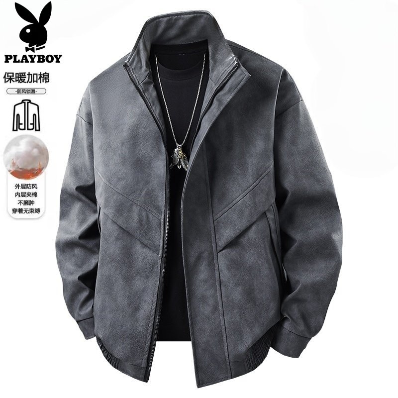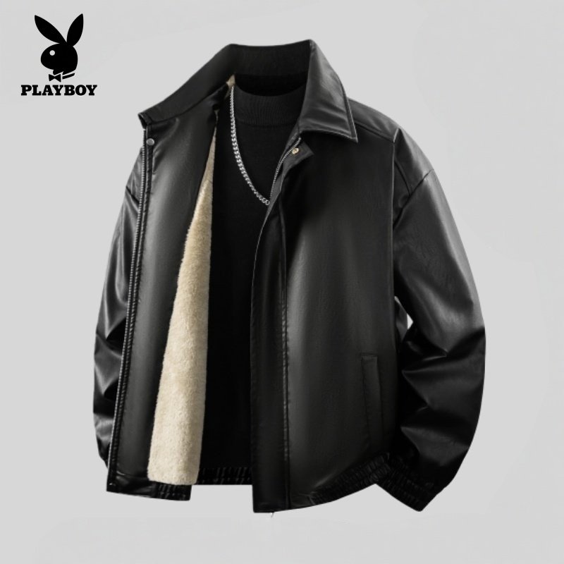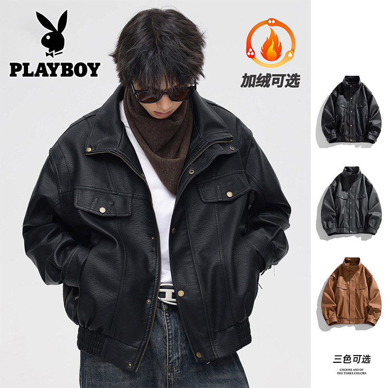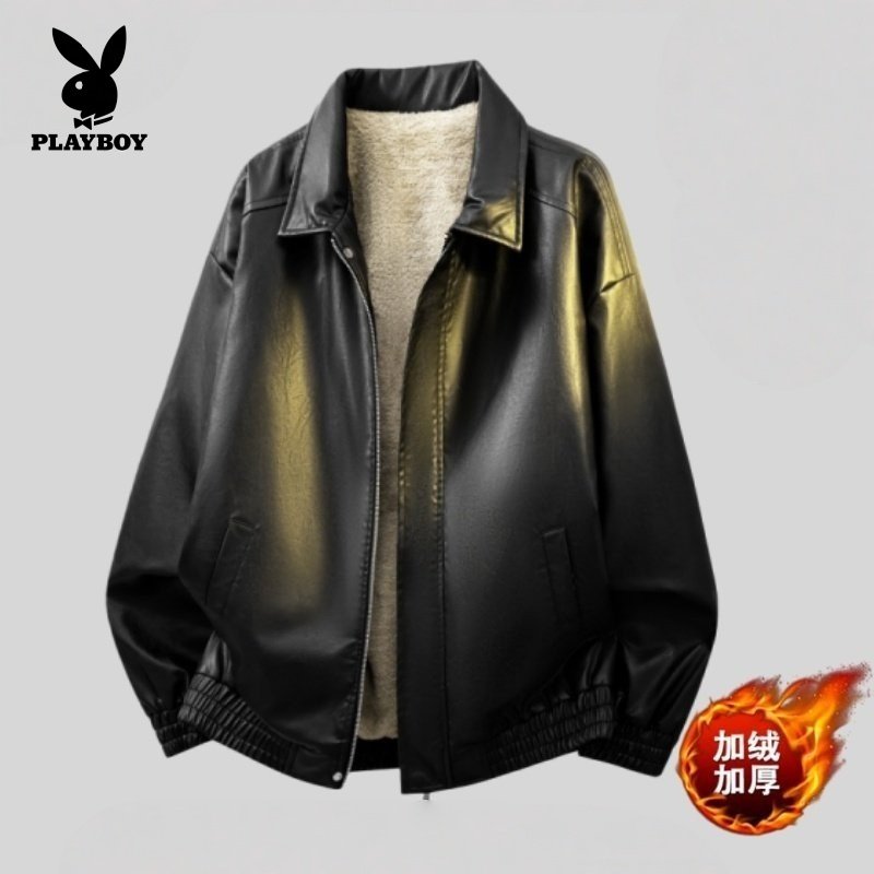 花花公子新款PU皮夹克男士春秋冬季加绒加厚宽松保暖机车皮衣外套