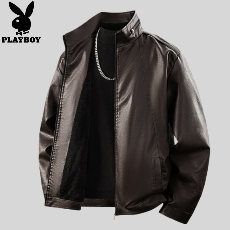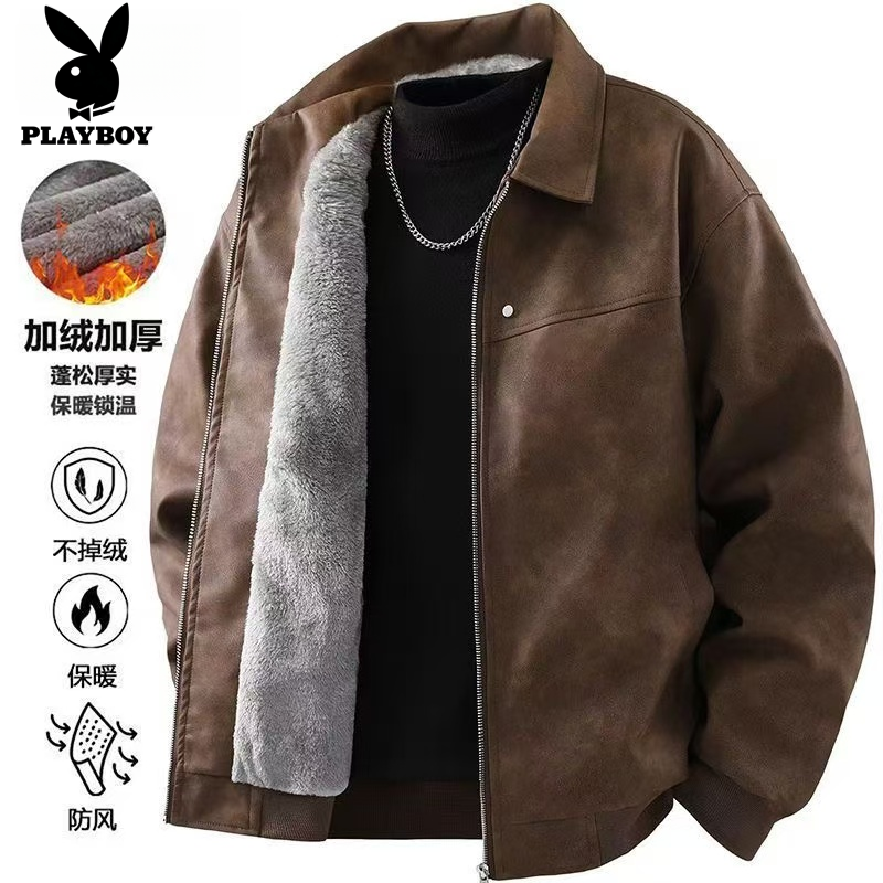 花花公子男士皮衣2025冬季复古保暖夹克潮加绒加厚休闲宽松皮外套