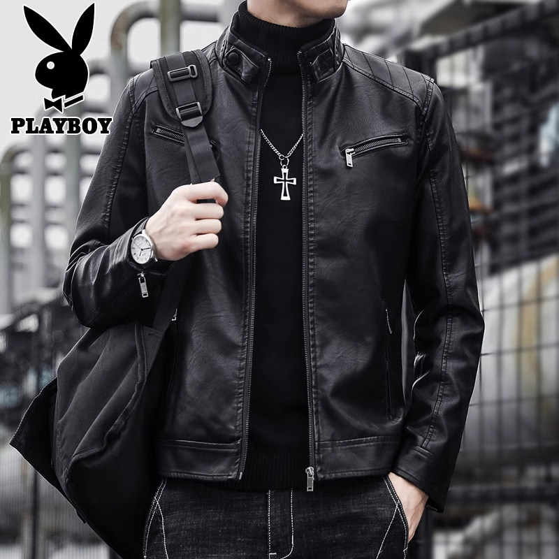 花花公子立领皮衣外套男士秋冬季新款痞帅机车服加绒黑色皮夹克男