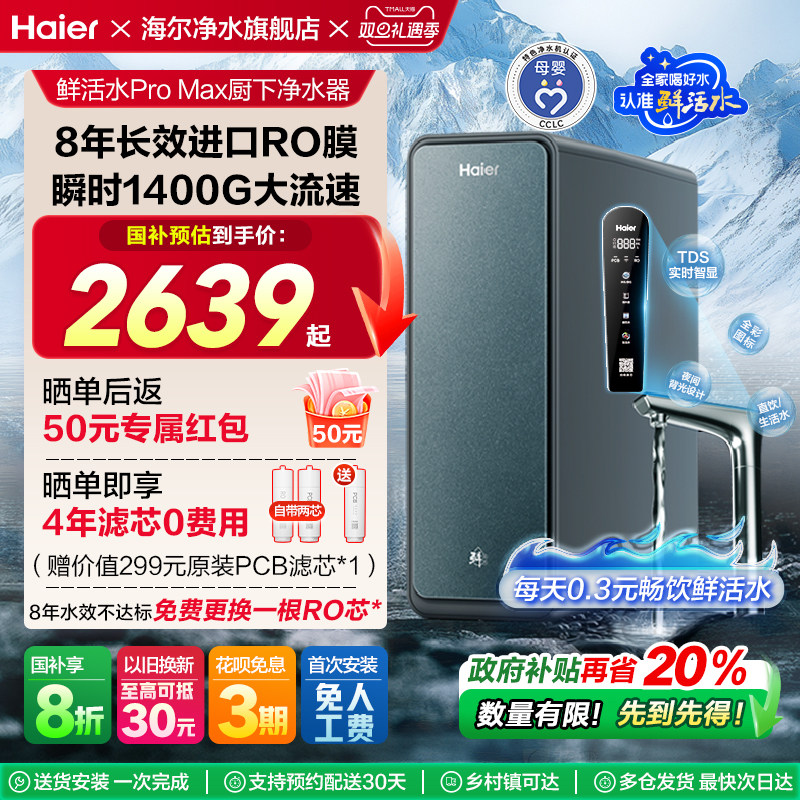 【政府补贴】海尔净水器家用直饮厨卫反渗透净饮智慧鲜活水PROMAX