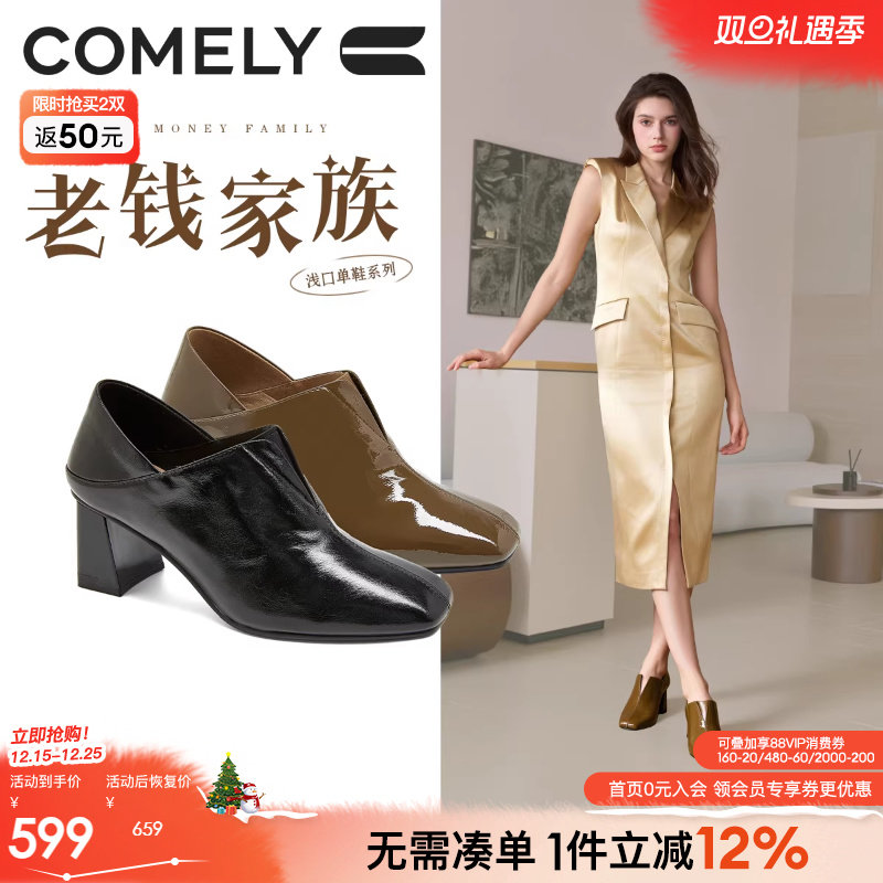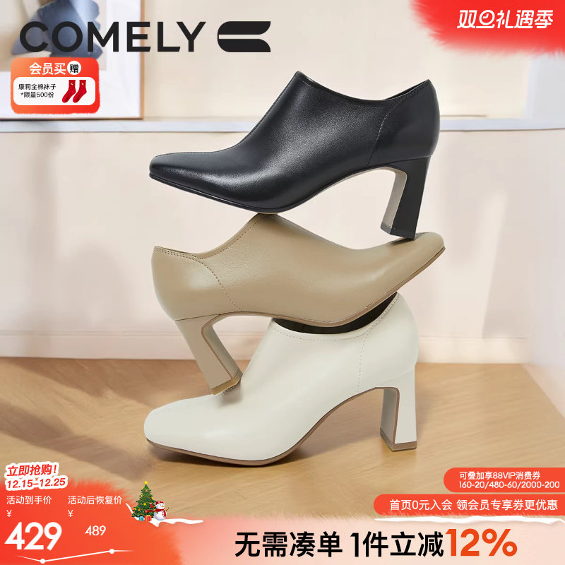 康莉粗跟裸靴女2025秋冬新款高跟深口单鞋老钱风小皮鞋商场同款