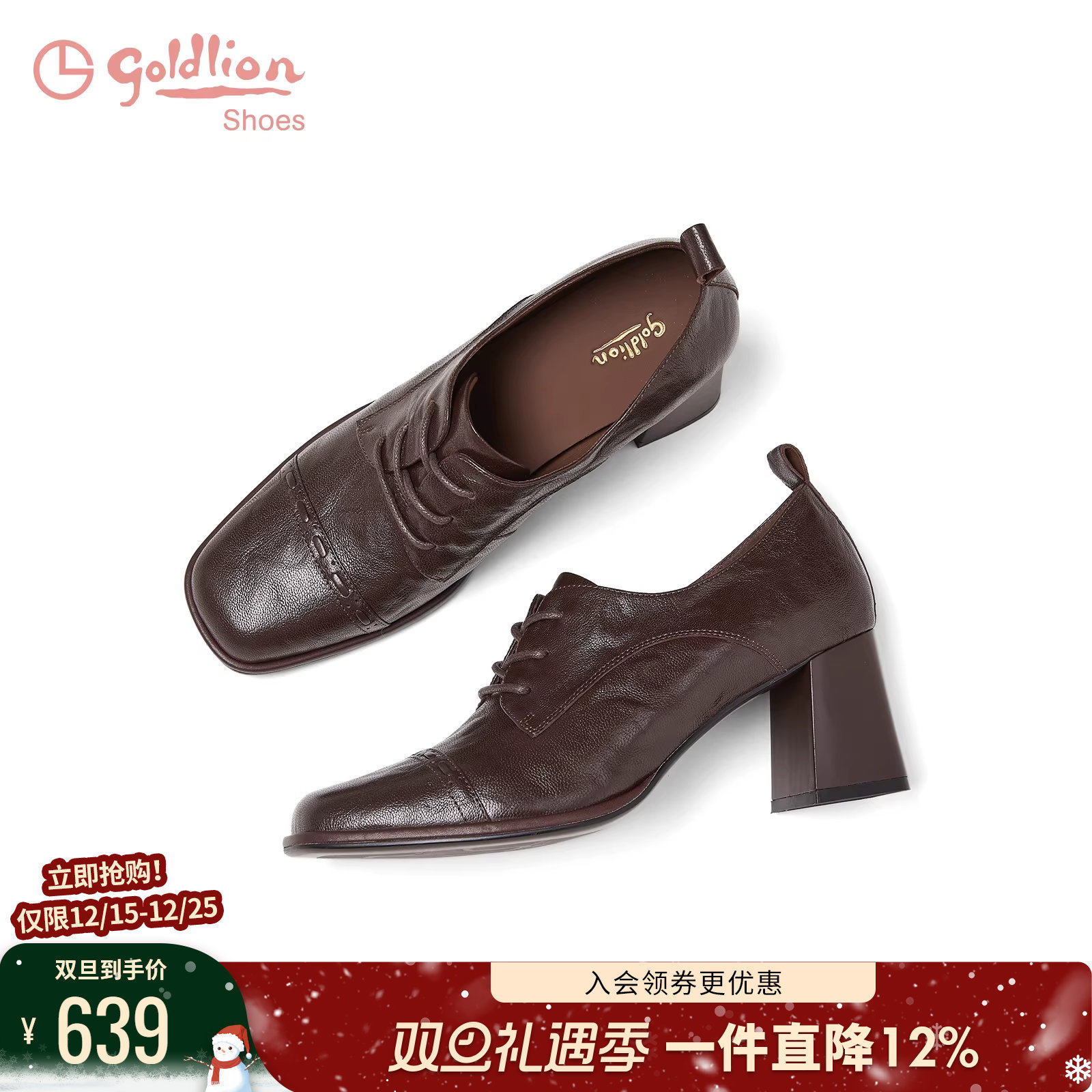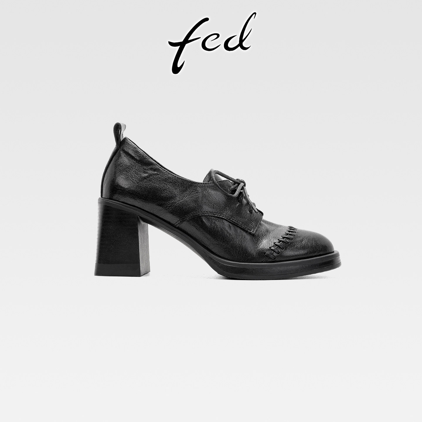 fed英伦风真皮粗跟乐福鞋女复古系带小皮鞋气质圆头高跟深口单鞋