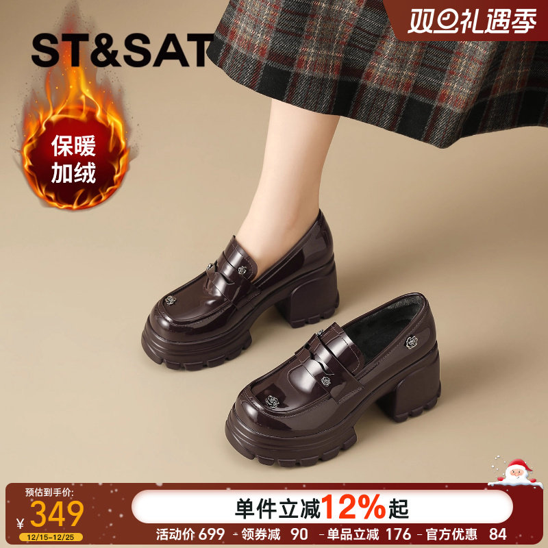 星期六厚底乐福鞋女加绒2025新款冬季保暖高跟深口单鞋女士小皮鞋