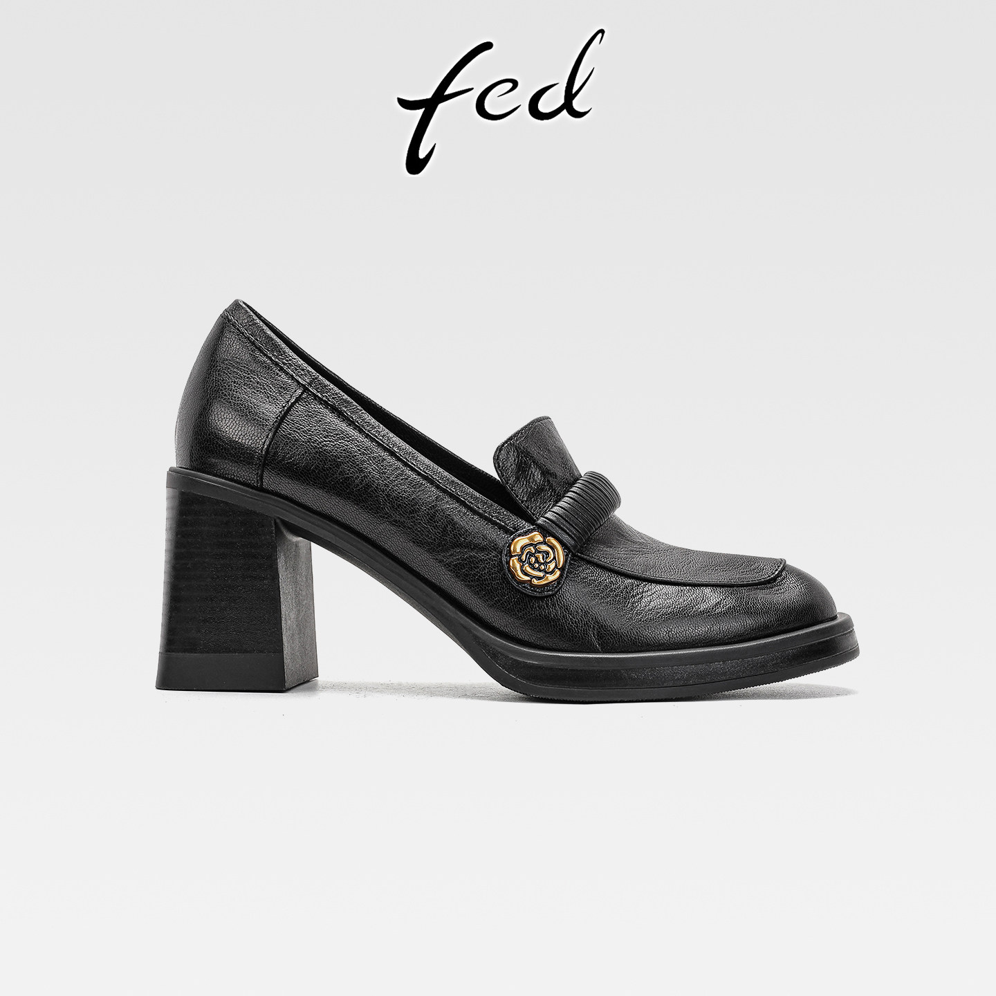 fed羊皮粗跟厚底山茶花乐福鞋女复古小皮鞋气质圆头高跟深口单鞋