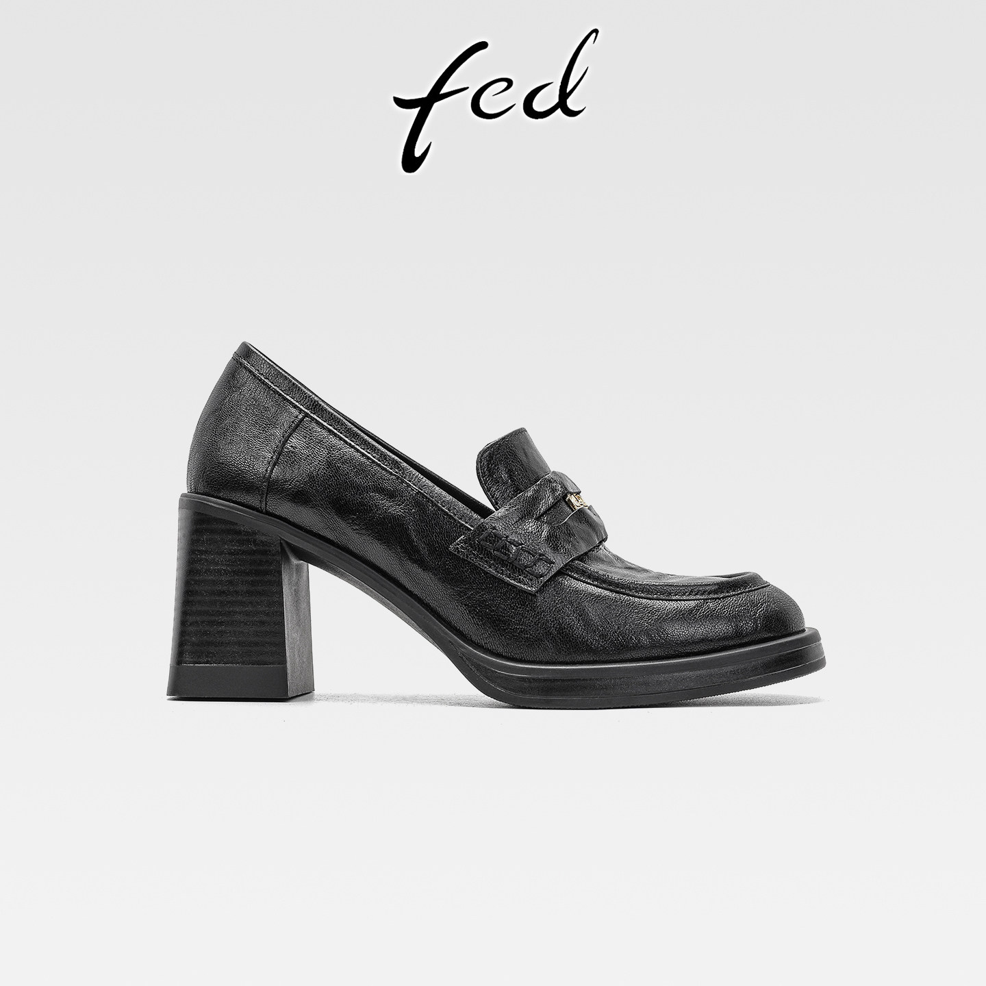 fed英伦风真皮粗跟乐福鞋女皮带扣小皮鞋一脚蹬圆头高跟深口单鞋