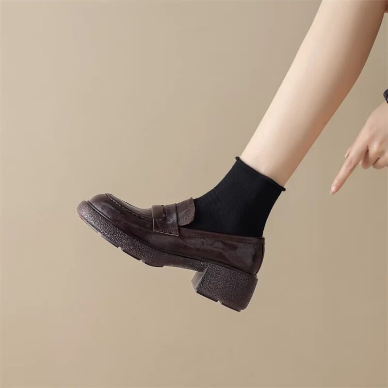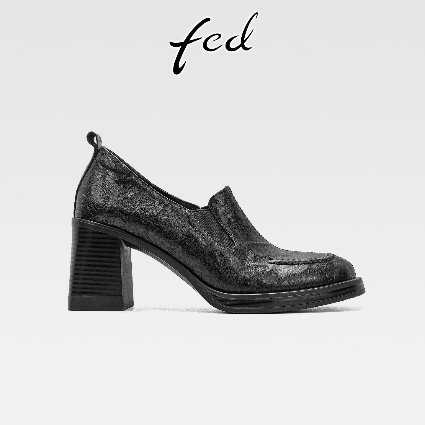 fed羊皮粗跟厚底乐福鞋女复古小皮鞋一脚蹬气质圆头高跟深口单鞋