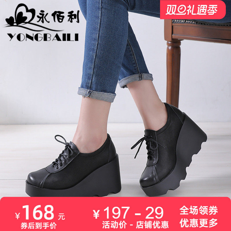 2025春新款休闲厚底坡跟高跟深口单鞋女真皮百搭松糕鞋女鞋皮鞋