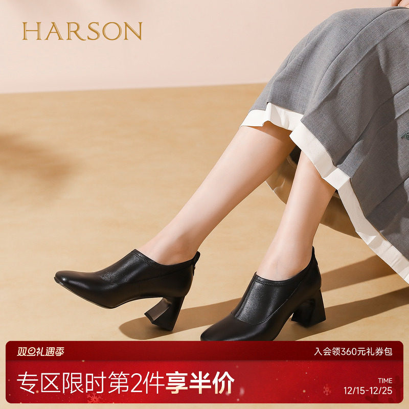 哈森秋季新款时尚单靴方头粗高跟深口单鞋女软皮踝靴HL228101