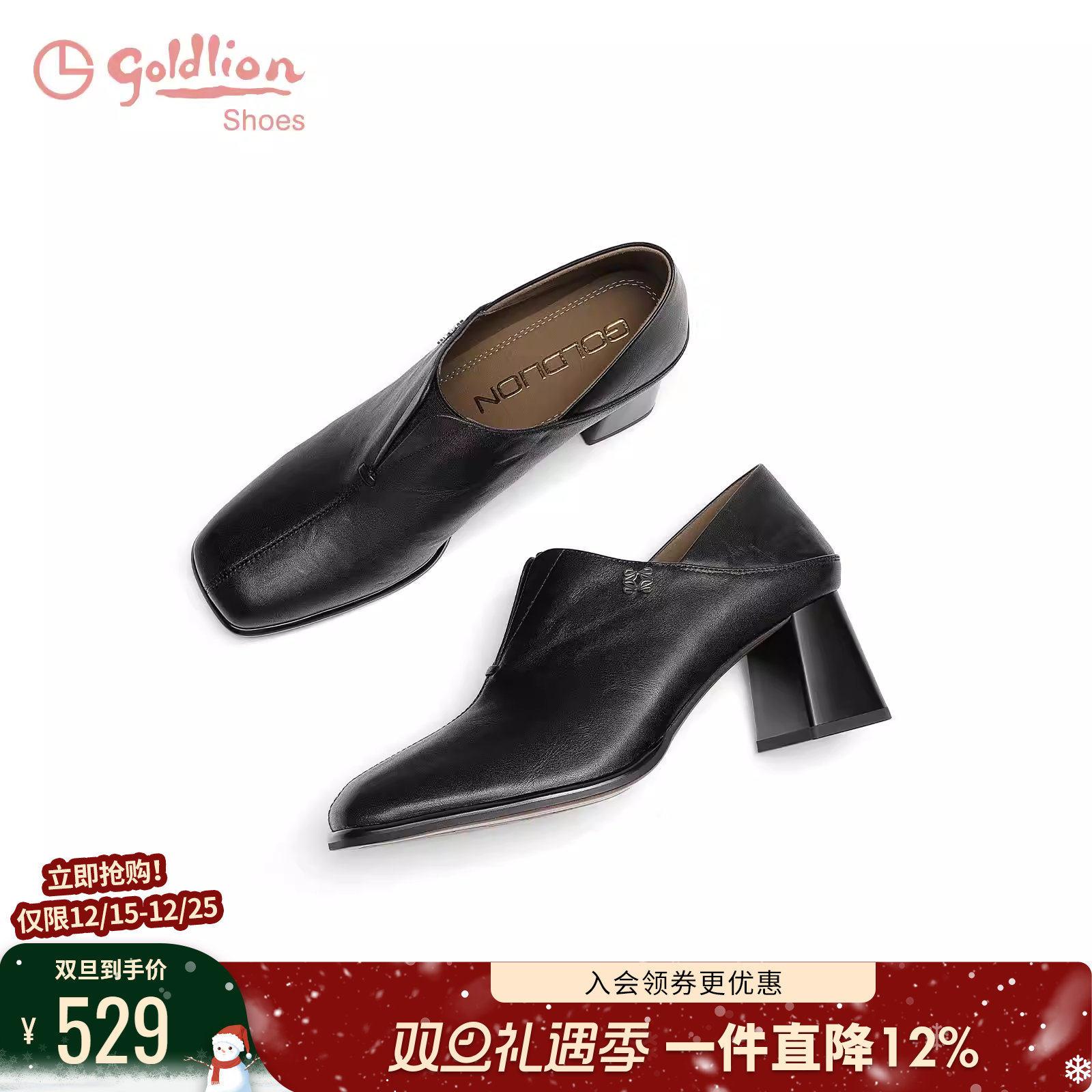 金利来女鞋春秋新款黑色百搭真皮粗跟小皮鞋一脚蹬高跟深口单鞋女