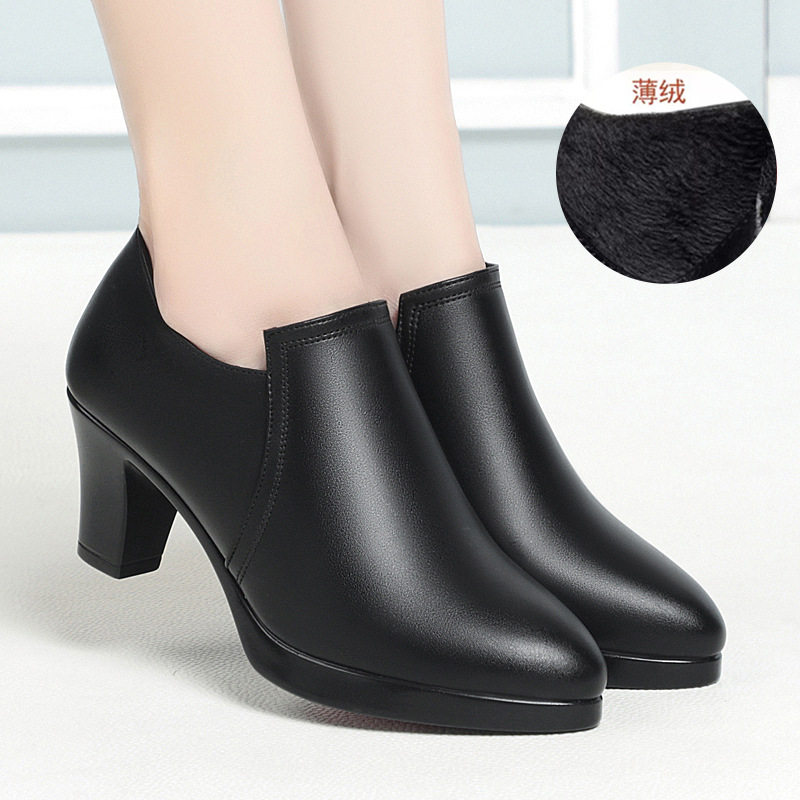 春秋爆款优质软皮高跟深口单鞋女士粗跟防水台圆头百搭黑色小皮鞋