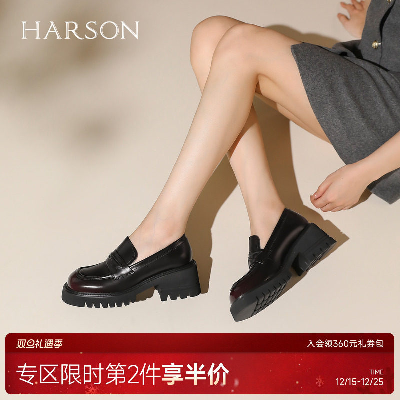 哈森秋季新款时尚休闲圆头乐福鞋粗高跟深口单鞋女HL228806