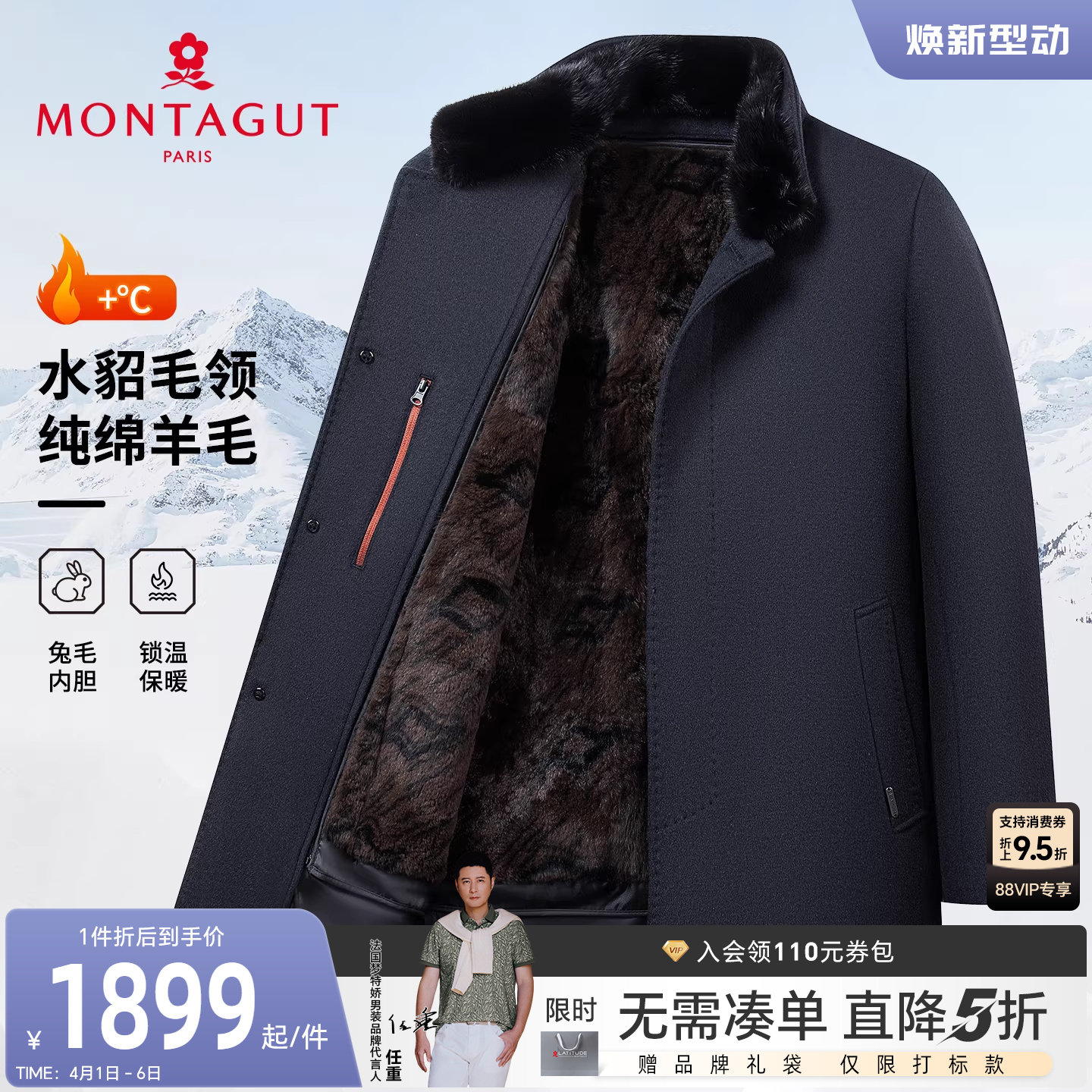 [水貂毛领/兔毛内胆]梦特娇男士鹅绒皮草冬款翻领羊毛外套保暖厚J