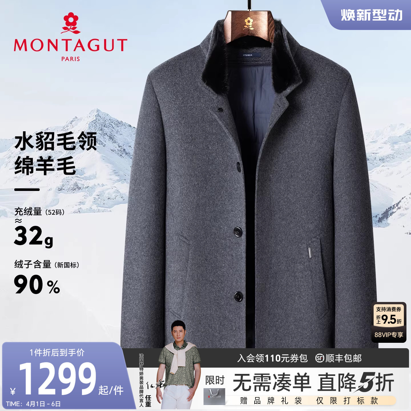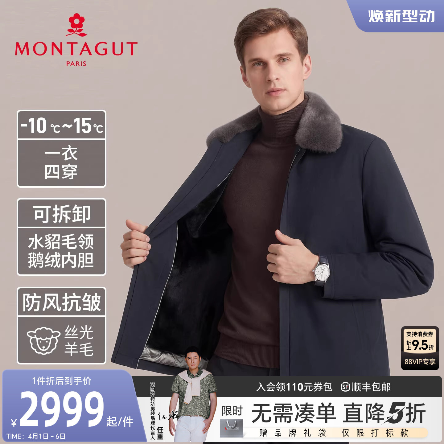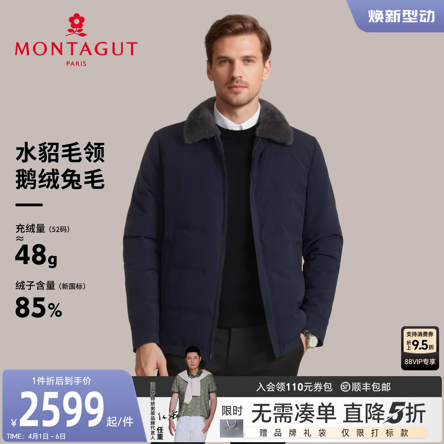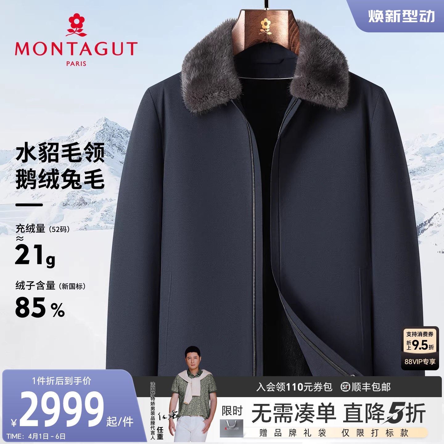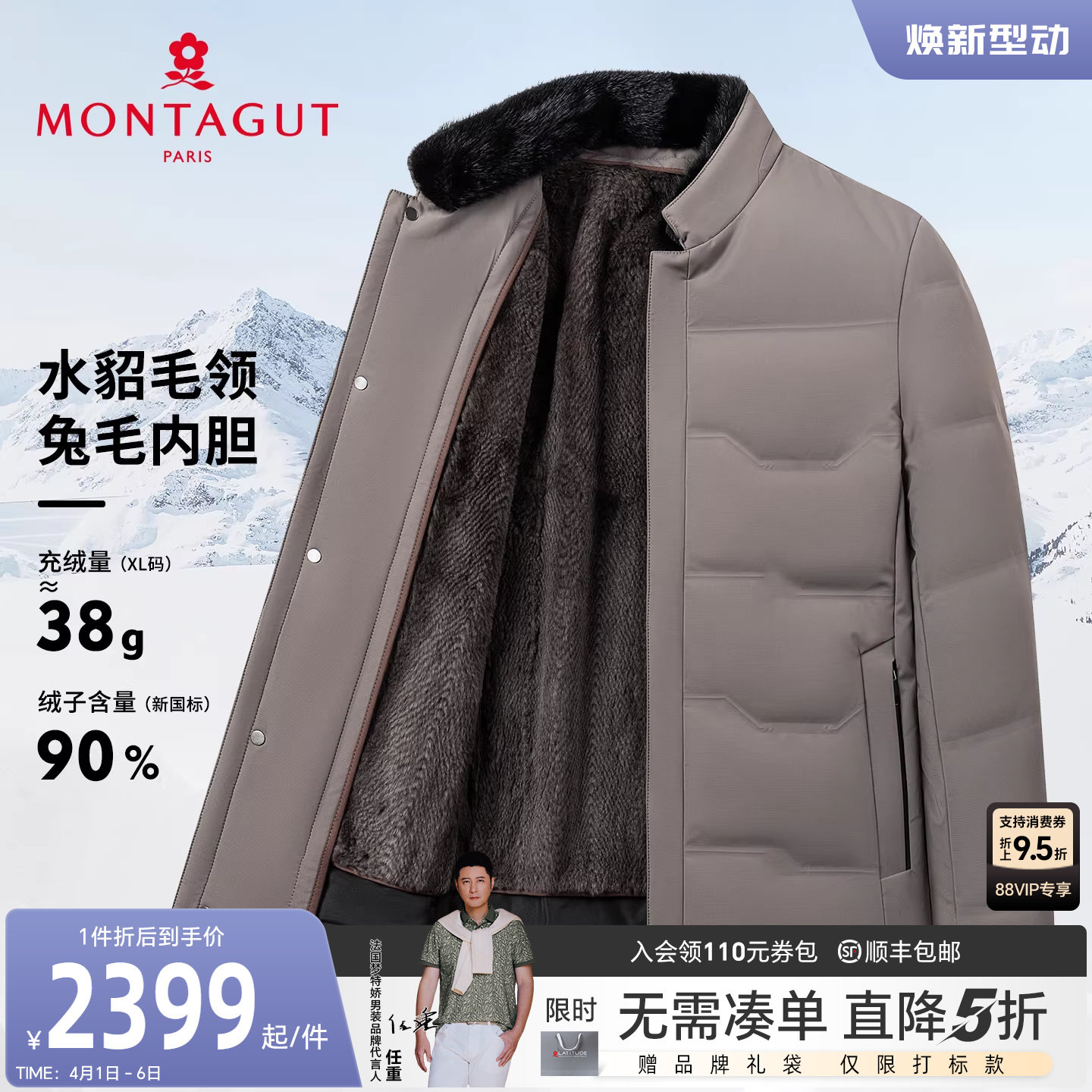 [水貂毛领/兔毛鹅绒]梦特娇男士羽绒尼克服冬装皮草轻奢外套保暖J