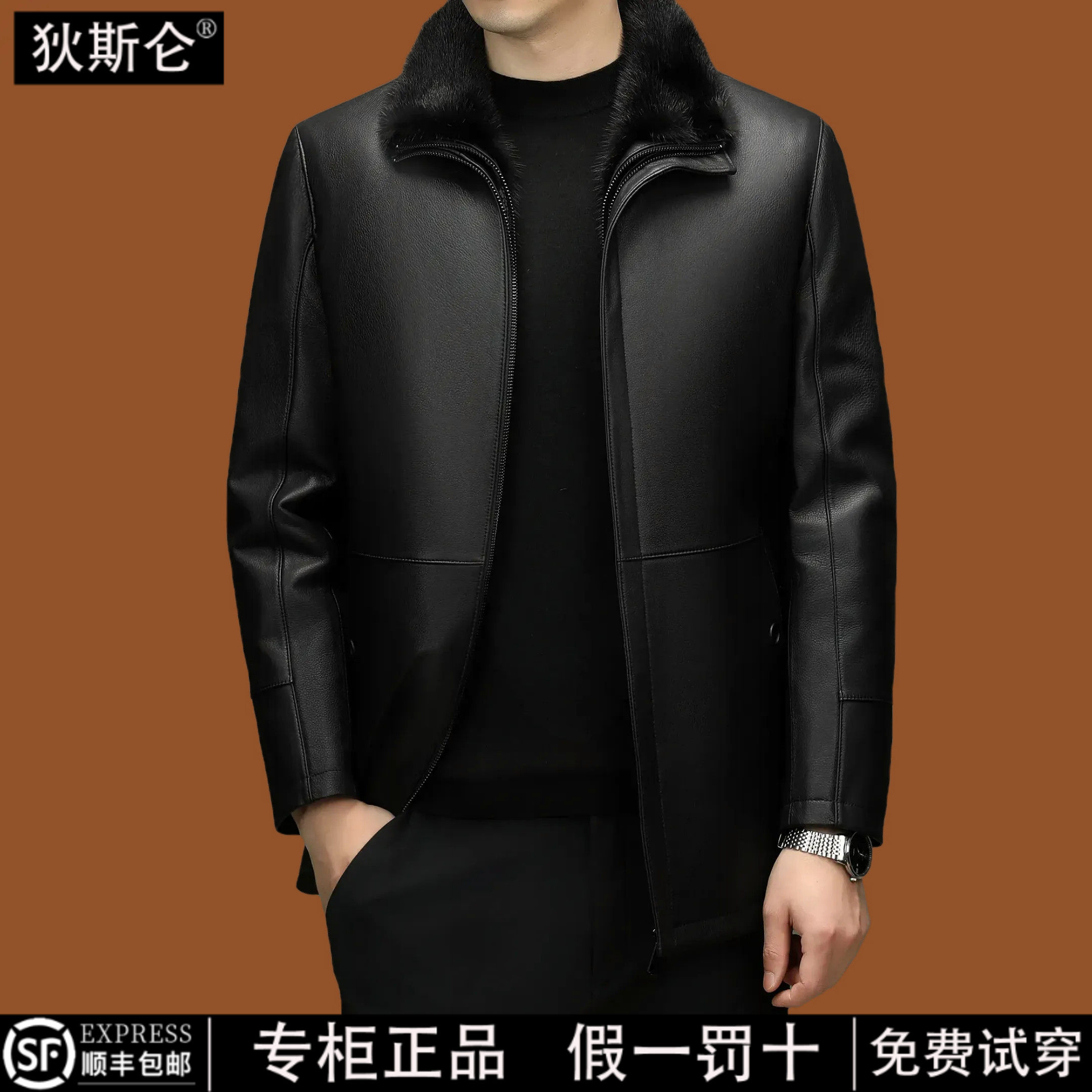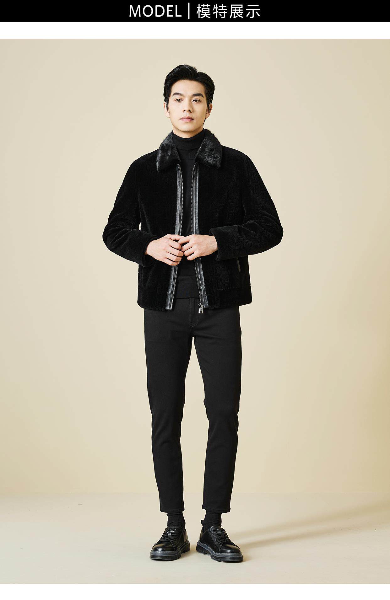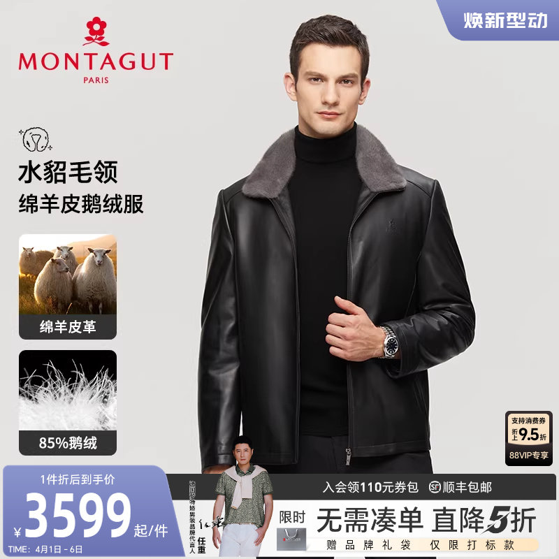 [绵羊皮/水貂毛领/鹅绒内胆]梦特娇冬季男士真皮衣羽绒外套保暖J
