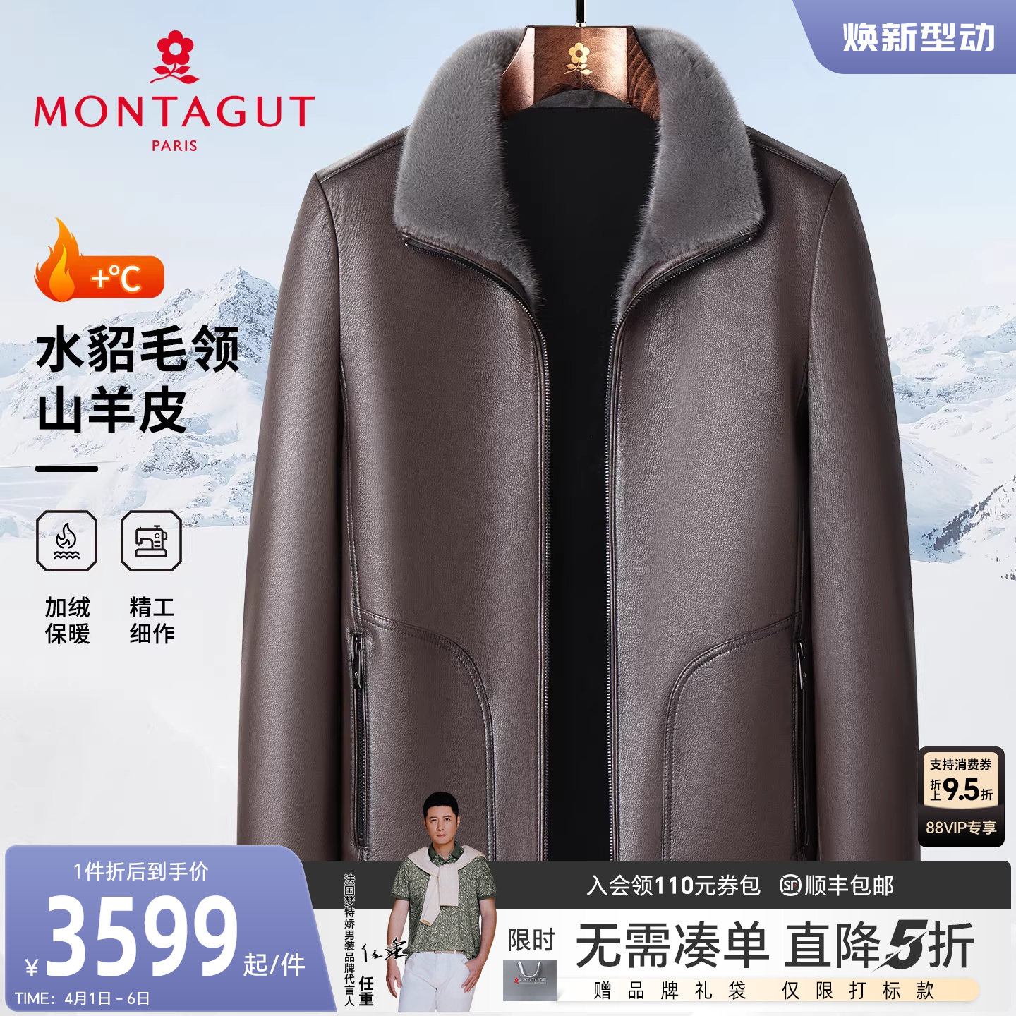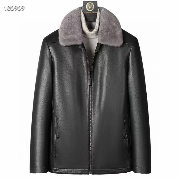 [山羊皮/水貂毛领]梦特娇男士真皮皮衣冬季商务夹克加绒外套保暖J