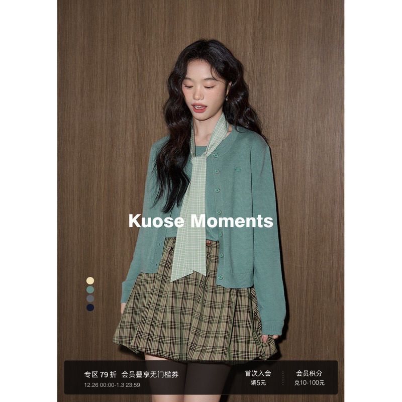 CountryMoment羊毛混纺/复古圆领针织开衫秋冬外套绿色毛衣女外搭