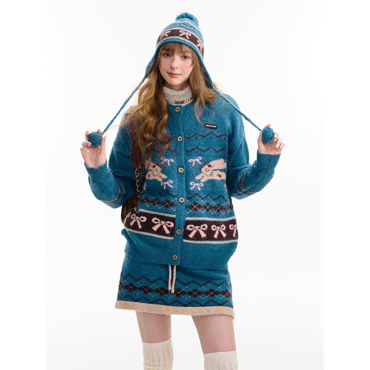 ziziFei秋冬季复古设计感费尔岛兔子蝴蝶结蓝绿色毛衣开衫外套女